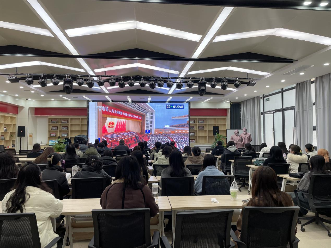(通讯员 章萌、申梦莎)3月5日上午9时,第十四届全国人民代表大会第二次会议在北京人民大会堂开幕,国务院总理李强代表国务院作政府工作报告。马克思主义公司党委组织师生通过电脑、手机客户端、电视直播等方式收看开幕会直播,第一时间学习政府工作报告、关注两会热点、畅谈两会话题。