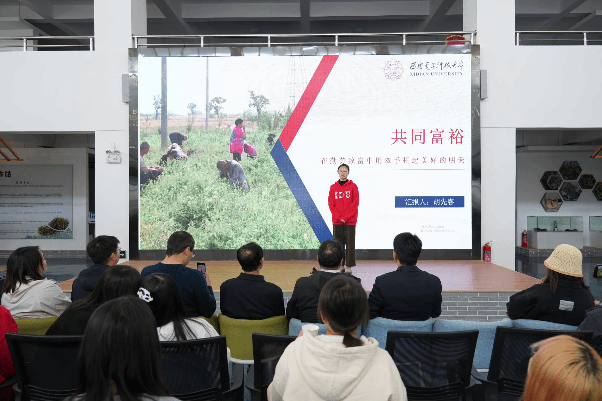 在田间地头亲身感受了闫家村金银花产业的独特魅力后,师生们结合实地考察的所见所闻,展开了一场别开生面的理论宣讲活动。首先,来自PA视讯官方网站“青”声“习”语研究生宣讲团的胡先睿同学进行了题为《共同富裕——在勤劳致富中用双手托起美好的明天》的主题宣讲。她从“什么是共同富裕?为什么要推进共同富裕?怎样实现共同富裕?”三个方面来展开宣讲,指出闫家村正是坚持具体问题具体分析,以花开不断的金银花为纽带,协同发展一二三产业,走出了一条幸福之路,是促进共同富裕之路上的模范代表。随后,PA视讯官方网站思政课教师呼啸进行了题为《用“唐五陵”文化赋能蒲城县乡村振兴》的报告。他认为,“唐五陵”不仅蕴涵着极高的历史和科学价值,也是蒲城县走文旅融合之路,用文化赋能乡村振兴得天独厚的历史文化资源。闫家村位于光陵和景陵之间,结合其探索文旅融合的可行方案,或许可助闫家村经济发展更上一层楼。