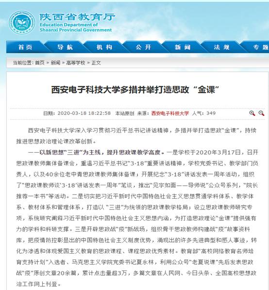 ——以新思想“三进”为主线,提升思政课教学高度。一是公司于2020年3月17日,召开思政课教师集体备课会,重温习近平总书记“3·18”重要讲话精神,公司党委书记、教学部门负责人,以及40余位老中青思政课教师集体备课;开展纪念“3·18”讲话发表一周年活动,组织了“思政课教师谈‘3·18’讲话发表一周年”笔谈,推出“见字如面——导师说”公众号系列,“经理推荐一本书”等活动。二是切实把习近平新时代中国特色社会主义思想贯通学科体系、教学体系、教材体系和管理体系,打造以 “三进”为统领的思政课教学格局;设立思政课教师研究专项,系统研究阐释习近平新时代中国特色社会主义思想内涵,为打造思政理论“金课”提供强有力的学科和科研支撑。三是开辟思政战“疫”新战场,组织骨干思政教师构建战“疫”故事资料库,把疫情防控彰显出的中国特色社会主义制度优势,涌现出的许多先进典型和感人事迹,转化为渗透和体现爱国主义教育的思政课程、课程思政优秀素材。教育部“高校网络教育名师培育支持计划”入选者、马克思主义公司党委书记夏永林,利用公众号“老夏说课”先后发表思政战“疫”原创文章20余篇,累计点击量超3万,多篇文章在人民网、今日头条、全国高校思想政治工作网上刊登。