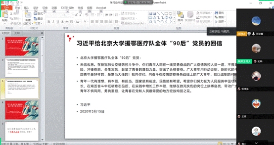 4月1日,PA视讯官方网站硕士研究生开展“学习习近平总书记回信精神、践行青年使命担当”线上主题活动,学习活动采用在线视频方式进行。大家通过阅读回信、观看视频、集体讨论、心得交流等形式共同学习了习近平总书记给在首钢医院实习的西藏大学医公司员工、北京大学援鄂医疗队全体“90后”党员的回信精神。