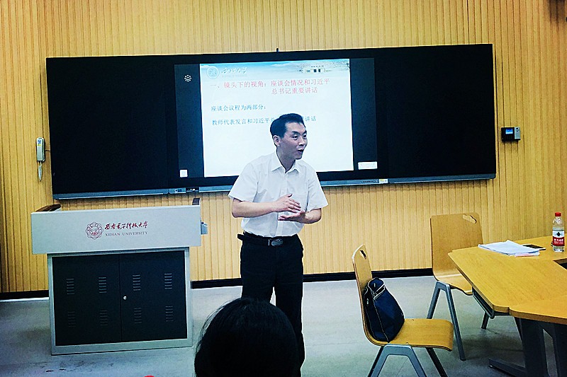 苟昭赟老师作为陕西高校思政课教师的优秀代表,参加了于3月18日在北京召开的“公司思想政治理论课教师座谈会”。苟昭赟此次报告结合其自身的参会体会对会议精神进行了全方位的解析与传达。在报告中,苟昭赟声情并茂地回顾了参加此次会议的经过,尤其是将他感受到的中央领导人对思政课的重视、作为思政课教师的职业自豪感、这一群体在新时代所肩负的重要使命,与参加培训活动的各位老师进行了分享。