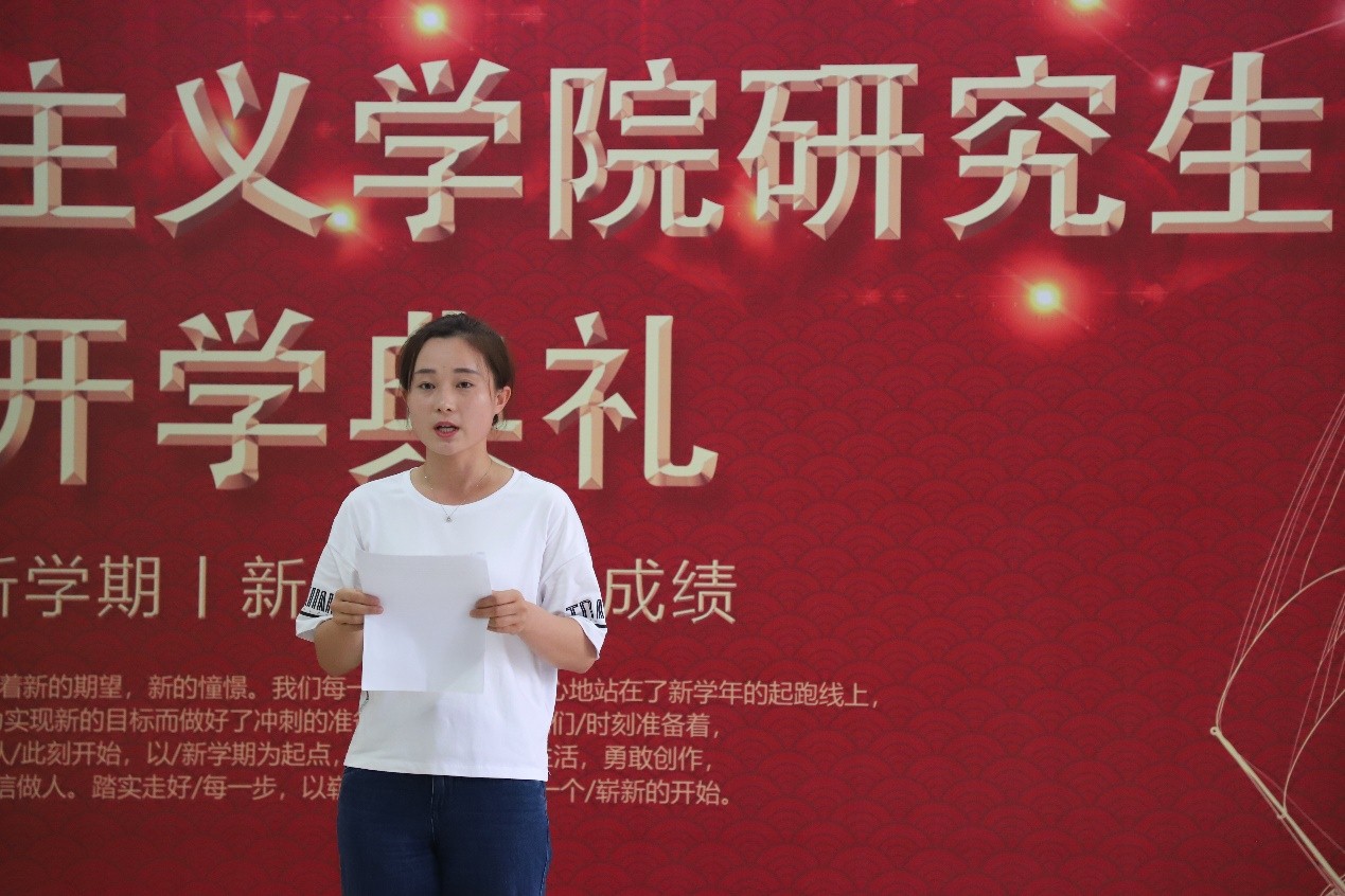 硕士生导师张丽珍副教授用三个关键词寄语新生。感谢——感谢同学们选择PA视讯官方网站,来到PA视讯官方网站;期待——期待同学们能够与这个世界建立精神关系,做到德智体美劳全面发展;祝愿——祝愿同学们经过三年的学习、自省,成为一名合格的马克思主义圣火传播者。