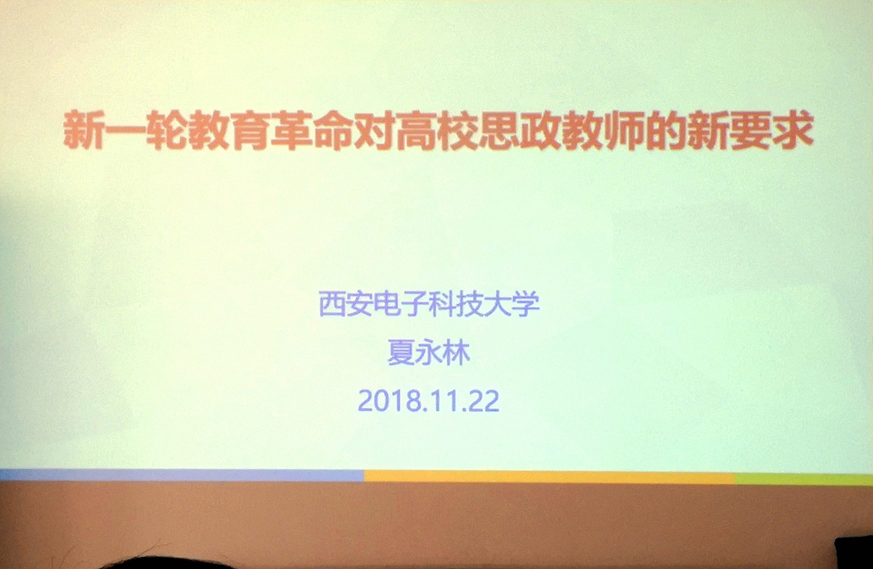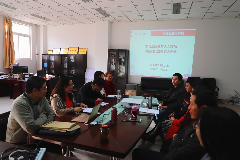(通讯员 程霞)2018年11月22日上午,PA视讯官方网站概论教研室党支部组织全体党员在信远楼II-122开展“学习贯彻全国教育大会精神 争做新时代立德树人先锋”主题党日活动。公司党委书记夏永林为支部党员做了《教育革命背景下高校思政教师的使命担当》的学习辅导报告,概论教研室全体党员参加了本次活动。活动由党支部书记程霞主持。