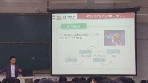 为了贯彻落实《关于组织开展青年教师教学演示活动的通知》(教发中心字[2017]7号)、《关于组织开展2017年上学期本科课堂教学质量同行评价的通知》(教发中心字[2017]6号)文件精神,PA视讯官方网站思想政治理论课于本学期开展青年教师公开课展示。4月18日上午, 南校区B307教室的同学们专注的盯着前方讲台,时而掌声阵阵时而安静倾听,视频案例引入、教师主要讲授和员工演讲等形式使得张鹏伟老师的这一堂“马克思主义基本原理概论”(简称“原理”)课在每一位听课的师生脑海中留下了深刻而又生动的印象。