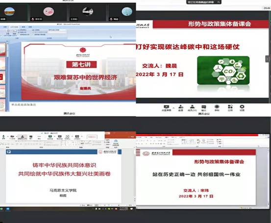 接着,形势与政策教研室魏晨、程霞、宋玮和赵普兵四位老师从教学目标、教学重点、教学方法、教学导入等方面分别就《打好实现碳达峰碳中和这场硬仗》、《铸牢中华民族共同体意识 共同绘就中华民族伟大复兴壮美画卷》、《站在历史正确一边 共创祖国统一伟业》、《艰难复苏中的世界经济》这四个专题以说课的形式做了分享,提供了很多有价值的补充素材,就如何提高课堂教学实效性提出可行性建议。