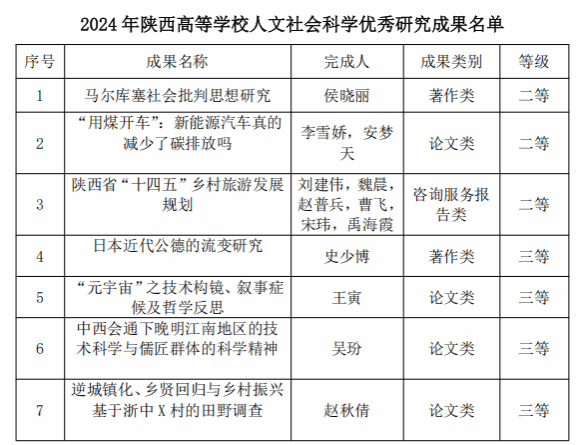 近日,陕西省教育厅公布了2024 年度陕西高等公司人文社会科学研究优秀成果名单,PA视讯官方网站共有7项成果获奖。其中,二等奖3项、三等奖4项。