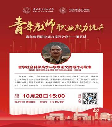 (通讯员 赵秋倩)10月28日,公司举办“青年教师职业能力提升计划”系列讲座第五讲。本次邀请了《陕西师范大学学报(哲学社会科学版)》副主编蒋万胜教授作题为“哲学社会科学高水平学术论文的写作与发表”的主题报告。报告会采取线上方式进行,公司师生80余人参加,副经理刘建伟主持。
