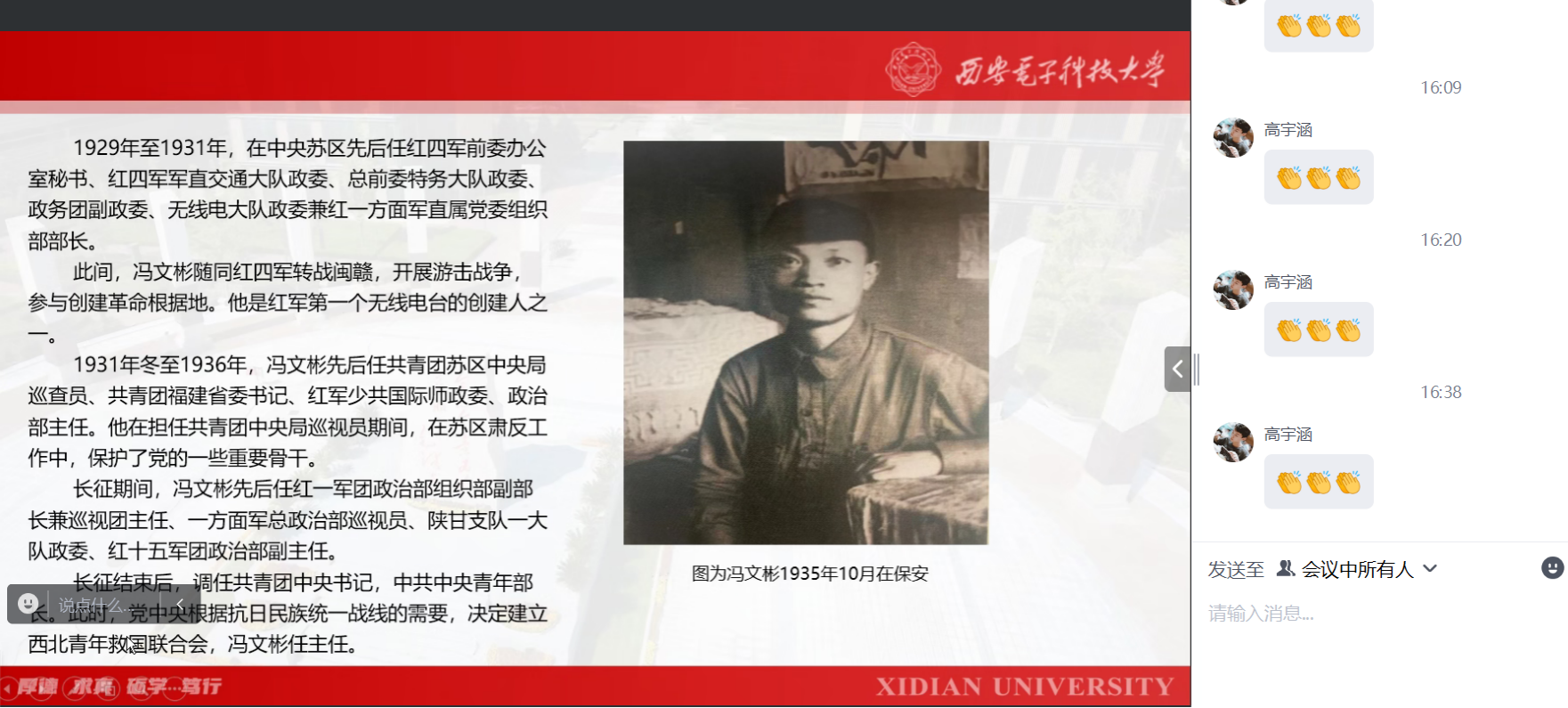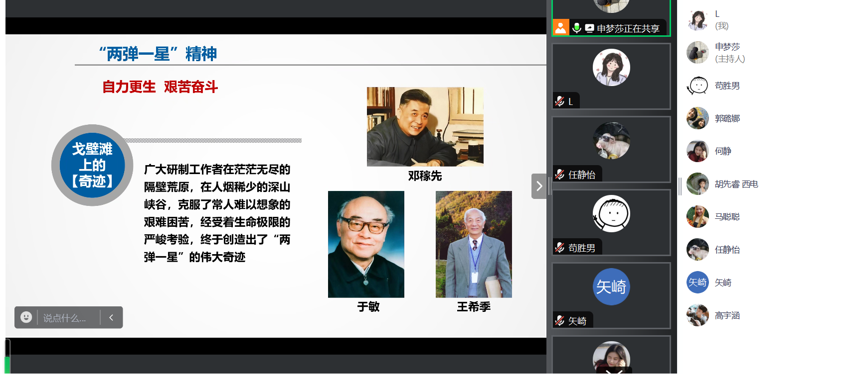 本次会议共有八位团员进行宣讲展示,旨在打磨新学期宣讲课程清单,为宣讲团成员把好内容关、文稿关、表达关,进一步提升宣讲质量和水平。团员苟胜男、申梦莎、何静、楼佳妮、马聪聪、任静怡、郭璐娜、胡先睿先后试讲了各自的宣讲内容,参会人员提出了相应的修改建议。