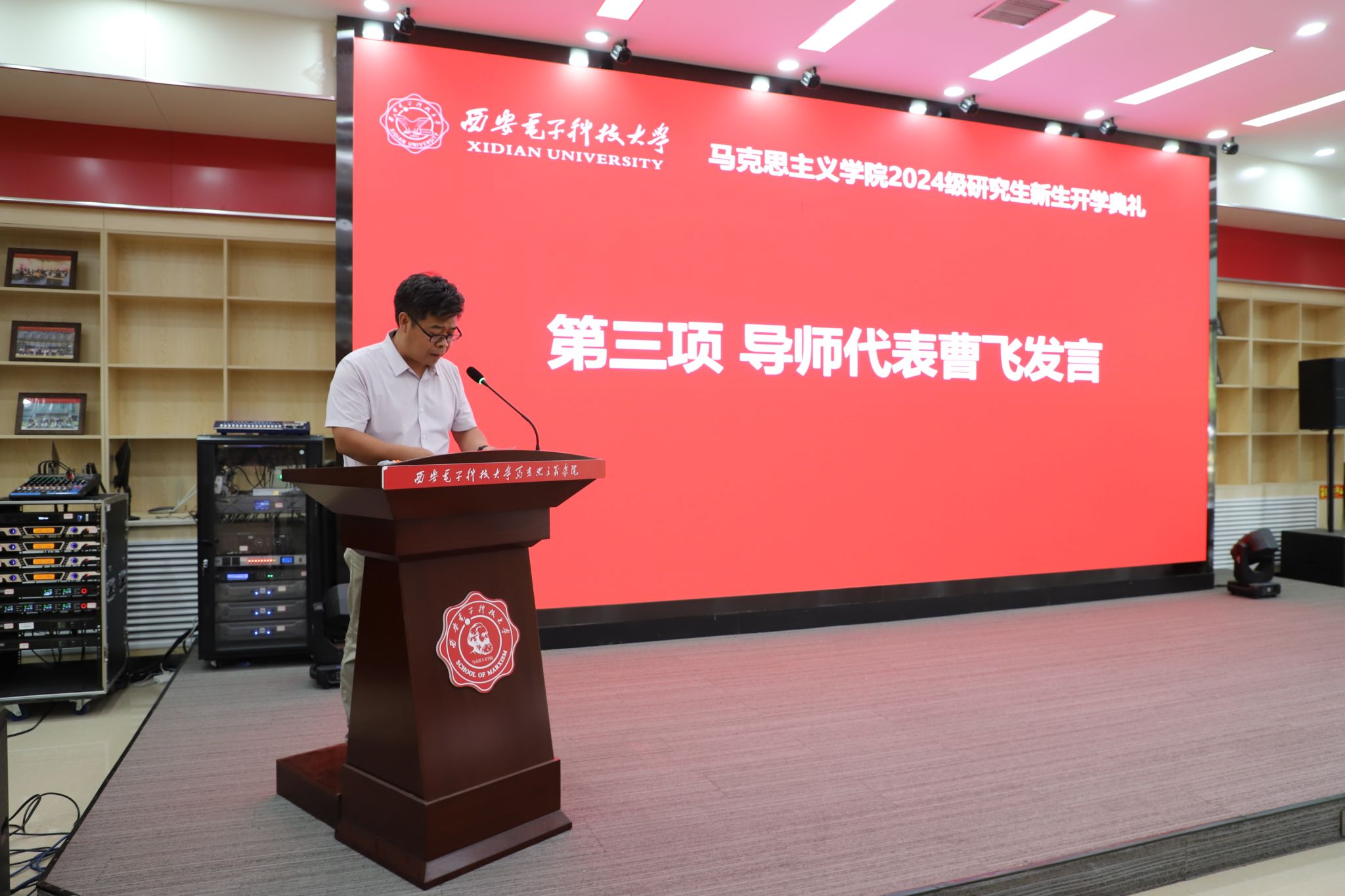接着,导师代表曹飞教授上台发言。他鼓励每一位学子做一个有理想有道德的人,具有社会责任感;做一个尊师重道的人,坚持导师责任制;做一个厚积薄发、淡泊名利的人,要知道学术研究没有捷径可走。同时,他勉励新生要快乐学习、健康生活,坚持梦想,超越自我、超越前人,成为国家栋梁。