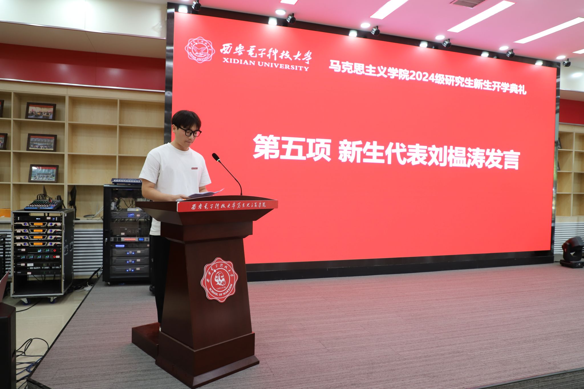 刘榅涛同学代表全体新生发言,他表达了对公司的憧憬和对学术研究的热情,承诺将像无数西电前辈一样不负韶华,努力学习,在强国建设和民族复兴伟业中不畏艰难,勇于拼搏,彰显担当。