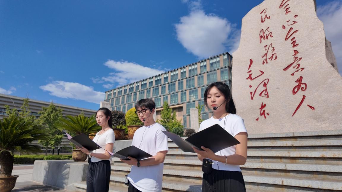 最后,活动进入集体诵读环节。在领诵人刘榅涛、苗可欣、王亚芳的带领下,全体人员齐声诵读《为人民服务》这篇经典文献,铿锵有力的声音回荡在纪念碑前,展现了新时代青年学子的坚定信念和昂扬斗志。这一刻,大家仿佛穿越时空,与革命先辈进行了一场心灵的对话和精神的传承。