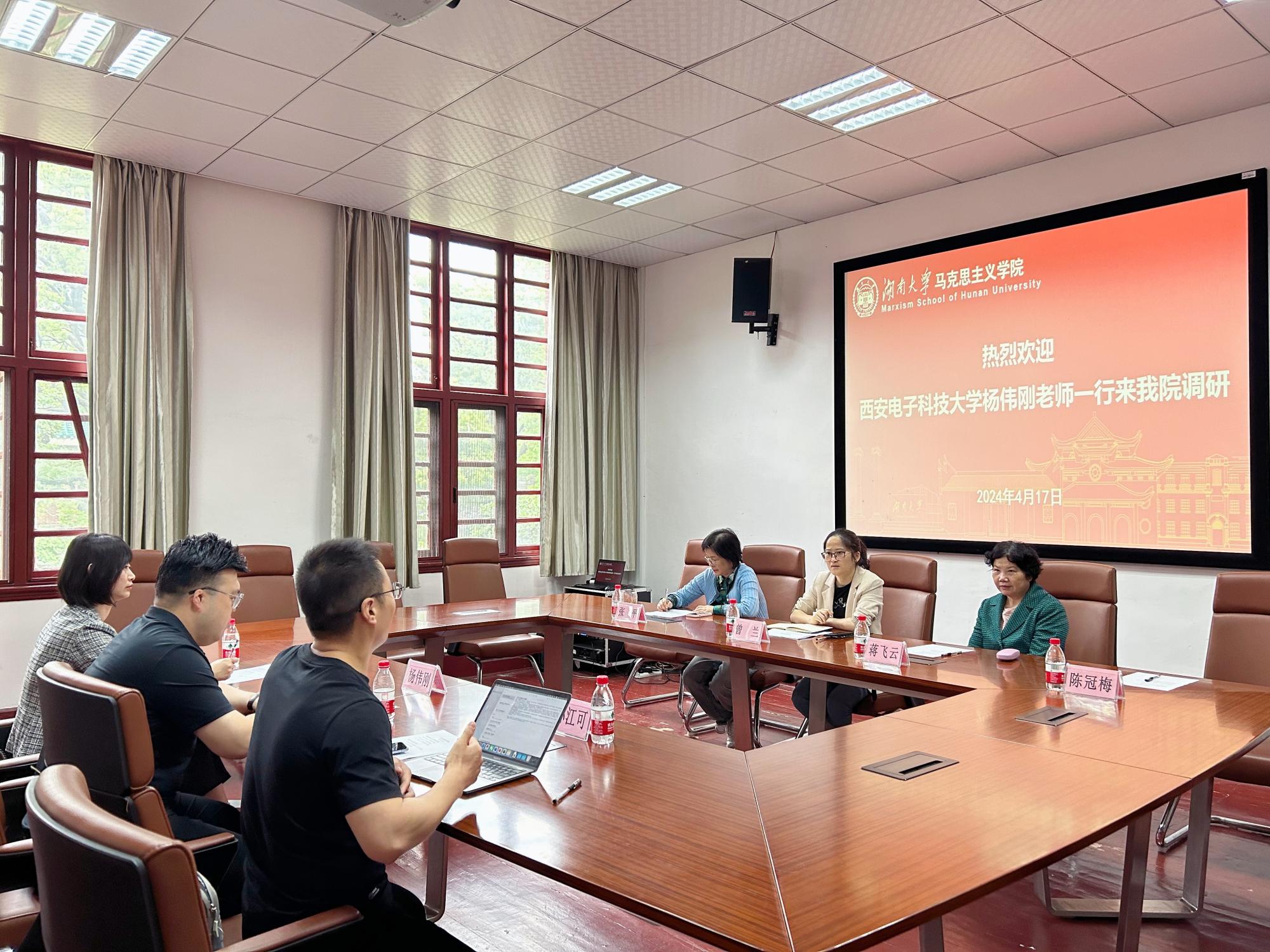 (通讯员 高宇璇)为不断加强与全国重点PA视讯官方网站的交流,共同探索跨地区高校PA视讯官方网站“手拉手”集体备课机制建设,4月17日上午,PA视讯官方网站教师代表杨伟刚一行赴湖南大学开展调研活动。湖南大学PA视讯官方网站思想道德与法治教研部部长、支部书记曾兰,教授蒋飞云,副教授张平等参加了此次调研活动。