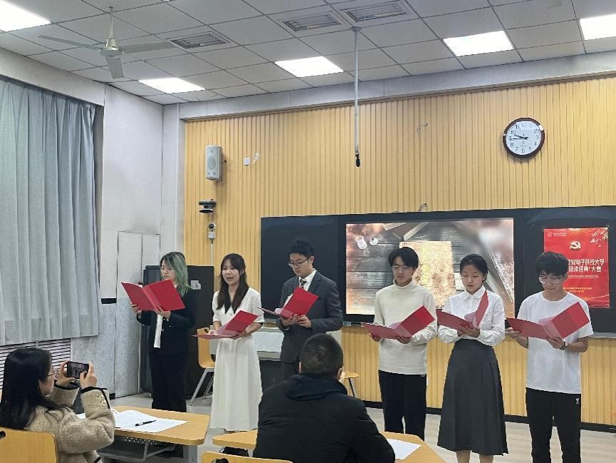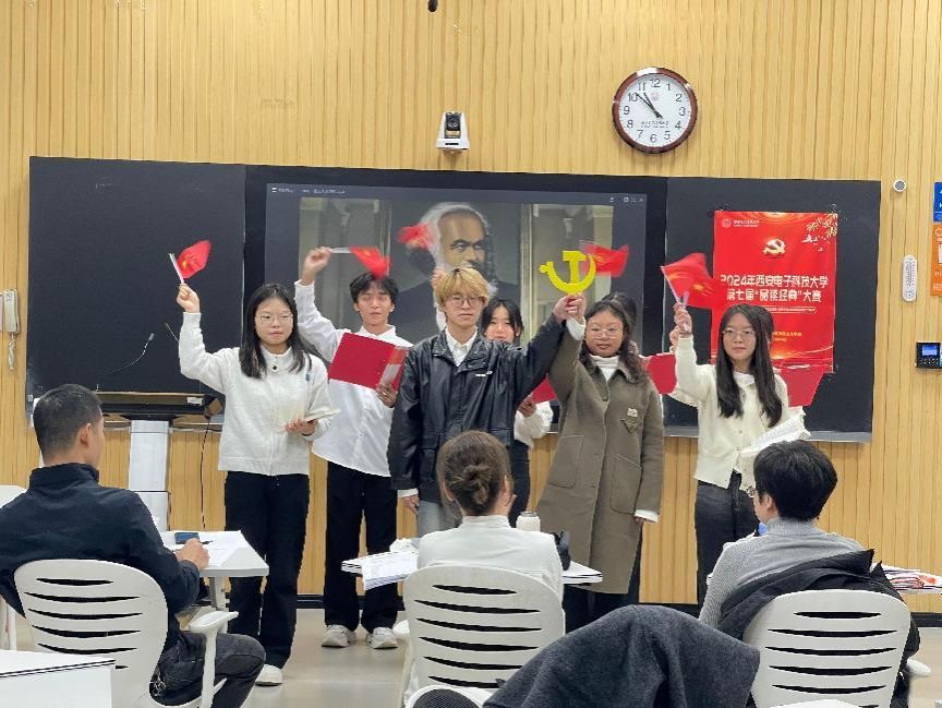 在举行了简短的开幕式和集体合影后,比赛正式开始。伴随着铿锵有力的诵读声和优美的乐曲,评委老师和同学们一道进入了经典的世界和思想的海洋。比赛中,参赛队员以饱满深沉的情感,抑扬顿挫的表达,或高呼如燕雀环空,或低吟如幽谷冷泉,或个人独诵,或集体合诵,沉浸式品味马克思主义经典穿越时空的理论魅力、价值引力和实践效力。其中,有的团队手中挥舞着国旗,表达着爱国强国的心声。评委老师们也被一幕幕激动感人的场景所打动!本次活动充分彰显了马克思主义经典的真理力量,激发了公司青年学子做强国先锋和信息尖兵的宏伟志向,厚植了爱国爱家的家国情怀,鼓舞了新时代新征程强国有我的使命担当。来自计算机科学公司的吉坤泽同学意犹未尽地说道:“十分有幸我和我的搭档可以进入此次朗诵比赛的决赛,此次比赛的主题是品读马克思主义经典作家和中国共产党人的著作和重要讲话。我们选择的朗诵篇目是《习近平谈治国理政》第四章的片段。通过此次朗诵活动,让我更加深刻体会到马克思主义中国化时代化最新理论成果——习近平新时代中国特色社会主义思想对党和国家事业的指导意义,让我明白了新时代我国对文化建设和文艺事业的高度重视,让我更加坚信马克思主义是我们党、国家和人民一定要坚守的理论和思想。”来自经济与管理公司的钟方略同学深有感触地表示:“参加诵读马克思主义经典活动,收获颇丰。翻开那些经典著作,仿佛走进了思想的宝库,马克思主义对历史规律的深刻洞察、对人类解放的孜孜追求,让我深受触动!在诵读过程中,和同伴们碰撞出思维火花,我们深深地体会到,马克思主义不再是抽象的理论,而是指引生活、照亮前路的力量。这次活动极大地激发了我学习马克思主义经典著作的兴趣,并希望在以后的学习生活中可以用先进理论武装自己,不断提升自身思想觉悟和理论素养。”来自外国语公司的范昕瑶同学分享说:“在经典中感受到真正的马克思主义,以富有逻辑和智慧的语言感受哲学的力量,激发我们在新时代新征程上履行好青年的责任与义务,不负韶华不负时光,为强国建设和民族复兴伟业做出自己应有的贡献。”