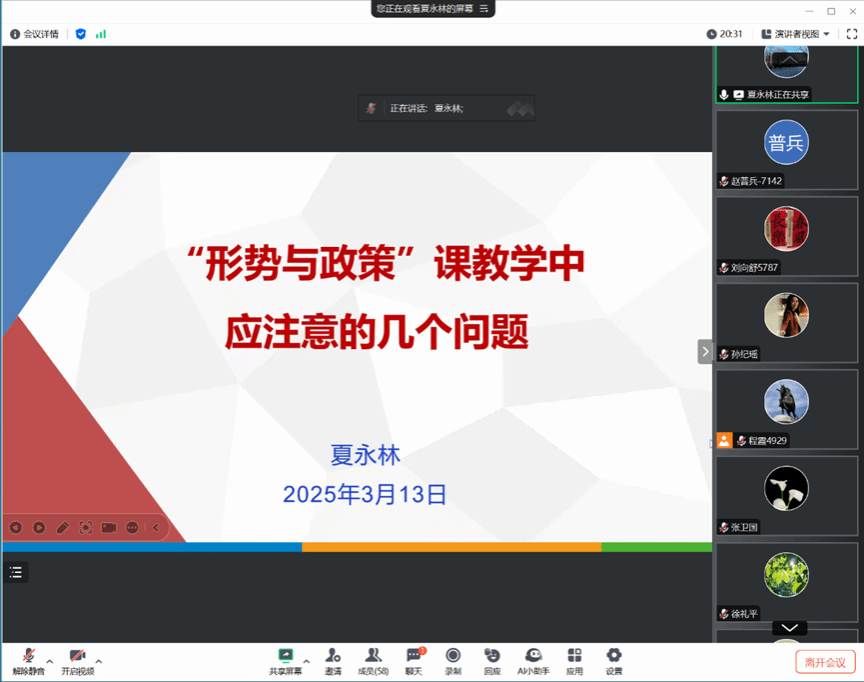 接着,PA视讯官方网站夏永林教授结合多年教学和担任教学竞赛指导教师和评委的丰富经历,从找准课程定位、精准发现问题、注重学习和积累等几个方面为课程组老师做了高屋建瓴、深入细致的分享和指导,提出了相应的教学建议。夏永林教授指出,作为一门综合性很强的高校思想政治理论必修课,“形势与政策”既不同于其他的几门思想政治理论课,也不同于一般的形势报告会。在教学实践中任课教师应紧扣“形势与政策”课特有的“新”、“清”和“准”的特点,具备马克思主义哲学思维,注重日常积累,把教学的“宏观视野、宏观要求”与员工“微观问题、微观要求”有机结合起来,在优化教学设计和运用多种教学手段的基础上,准确引导员工了解和分析国内外形势,辩证看待各项工作取得的成就和存在的挑战,增进对党和国家方针政策的认同度,从而进一步增强投身社会主义现代化强国建设的信心、责任感和使命感。