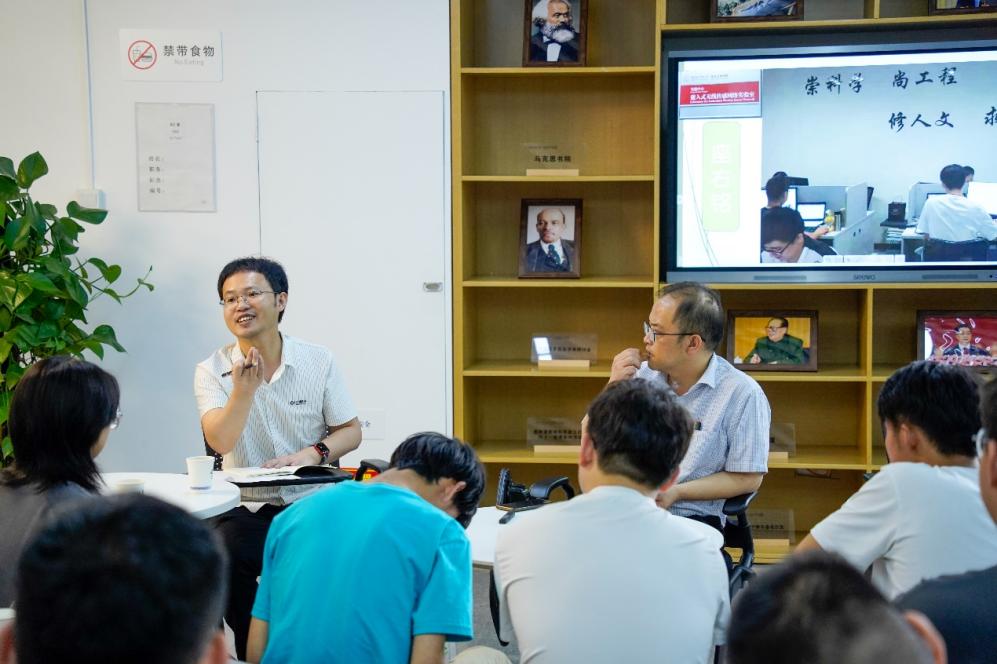 李泽玉同学认为理工精神不仅在于严谨的求证,更在于大胆的假设,数学和物理是非常浪漫的学科,在其中寻找知识间的联系,更加认识到世界的奇妙。只有提出新颖的理论,即使错误,那也是有很价值的。理工精神就是在认识世界,而人文精神是在认识自己。魏珞同同学讲述了自己尝试用模型将人文与科技结合,用量子纠缠原理解释科技人文之间的关系。荣钰成同学分享了自己学习中国近现代史纲要的观念转变对于学习理工学科的促进。冯筱晗同学从科技发展的角度出发提出要增强出题人的意识,汲取人文中实证的经验和方法,以更为主动的精神去展开学习与工作。姚安和李明轩同学都聚焦了怎样观察和描绘世界角度,认为科技与人文的交叉点上就是全面发展自己,要感受美,养成正确的观念。余文杰同学认为科学没有国界,人文与科技在许多方面存在交叉,例如天文学的发展就可以看出人文科技之间的密切关系。文雨点同学提到科技创新思维的培养,举出苹果公司推出的Vision Pro为例,讨论了科技标准的问题。蔺梓铭同学从手机的发展出发,谈到iPhone对按键手机形态产生变化来举例,论述了人文关怀对于这个创造的重要作用。电子工程公司入党积极分子陈雨龙同学结合邓老师提到务实与务虚的观点,提出科学研究不能缺乏人文元素的融入,举出中国传统思想中的“阴阳”概念对于科技发展的影响,主张注重逻辑模拟和情感交流,培养综合素质的科学思维。