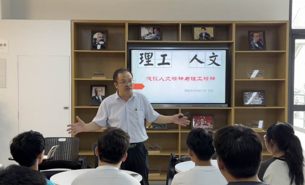 讨论开始,邓军教授为同学们精心准备了“浅谈人文精神和理工精神”专题报告,首先邓老师从“什么是理工精神和人文精神?”问题出发,引导大家思考思维意识的多样性,结合具体的历史背景和条件,训练逻辑与推理,培养学问与情怀,继承西电的工匠精神。